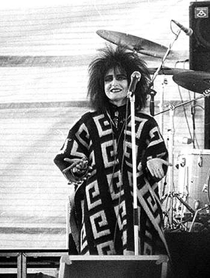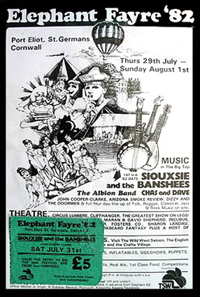 'Following the footsteps of a rag doll dance we are entranced. Spellbound' As legions of bristling spikes and glistening chains, outlandish pyramid cones and scanty leather minis are unloaded onto the stone cold slab that is Plymouth railway station, I begin to wonder why Siouxsie & The Banshees continue to inspire such blind fanaticism from a tribe they've long since outgrown. From Doncaster to Dumbfries, they've traveled in their thousands, drawn inwards on a pilgrimage to a most unholy cause. But then I realise the futility of attempting to conceptualise that instinctive hold, the natural magnetism that Siouxsie oozes. Following the mystic veil that cloaks The Banshees' calamitous wail, we are entranced. Spellbound. So let me tell you what happened at the Elephant Fayre instead. As we wander through the intricate maze of guidelines and tent pegs, the festival looks like a far more civilised affair than it's Somerset counterpart (Glastonbury). The biggest noises come from the barn dances and helter skelters of other rustic gigs (like drug tents!...). The punks and the hippies are getting on great... but will it last? At the focal point of the festival, a massive tent on the peak of a gentle hill. John Cooper Clarke digs another nail into the coffin of rock poetry as attention takes a drastic upward bent. A chapter of Hell's Angels have arrived and, they intend to make their presence known in their own inimitable fashion. The security seems haphazard to say the least, as one 'controller' said, 'The only thing we've done right all day is let the band in.' And speaking of which: 'From the cradle bars comes a beckoning voice/It sends you spinning/You have no choice.' After considerable pre-show discussion as to whether the band would be introduced as Bonnie Tyler And The Banshees, Siouxsie opens what will probably be their only UK appearance this year, in majestic form. Strutting and hopping, raucous and lacerating and flowing like liquid glass, the Banshee queen sneers and scowls at suspicions that she would be restrained. The essence of The Banshees on that metallic beauty far too much for it to be harnessed and controlled. And Sioux knows the charms of her irresistible hiss as she dances recklessly around the stage, clutching the precious microphone so close to her mouth. Dressed all in white she cuts a perverse persona. In the confines of the Fayre, all that sensationalised 'medical advise' is thrown into the Cornish wind as, at one point, she even stoops/stops to cackle hoarsely through a grin: 'I'm sorry I can't speak to you. I've lost my voice you know.' But the voice is simply a part of The Banshee spirit. Severin, McGeoch and Budgie perform their role with an equally ruthless efficiency. Severin cuts a cool, arrogant figurehead in his smart grey suit and perfectly arranged blond hair - and give him a lambretta and he'd look right at home in Quadrophenia. The bass guitarist picks out those enticing Banshee intros with an air of graceful detachment. McGeoch's pony tail swings in time as he blurts out the frenzied guitar. Budgie, you all know Budgie. Thump, Thump, Thump. The Banshees' set has changed considerably since last time I saw them - their infatuations with all things occult moving to the fore with ever-increasing steps. The magic of 'Ju Ju' blends in with the new songs and some old hits. But I ought to mention the trouble. The Banshees start up another subtle intro, the band begin that familiar low, mesmerising dance. The band speed up and the neo-pogo lunatics take control. There's nothing to do but dive out of the way as the bodies start flying. A bouncer gets attacked and uses his topless attacker as an ashtray. The 'controllers' remove a whole section of the audience through a side opening only to end up in a mass scrap outside. You've seen it all before but it isn't easy to accept. Back inside, 'Happy House' takes on a new, more insidious meaning. WE'RE ALL INSANE. What exactly are we doing here? Listening to 'Voodoo Dolly', 'Arabian Knights' and 'Spellbound' and more fireworks. Some people fainted, others decided it was time to leave. I was one of them. Who needs encores? Amrik Rai |