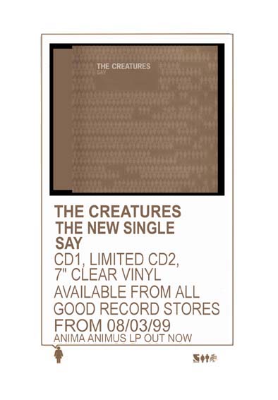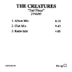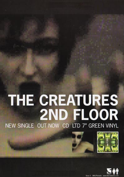 Title: 2nd FloorRelease Date: 5th October 98 Label: Sioux Records Format: 7”/CD THE CREATURES, now a full time occupation, have been busy after three years spent sorting out their Banshees ties...having just come back from a successful American tour and releasing their non chart eligible 4 track 'Eraser Cut' EP they are back for more with their '2nd Floor' single which is the first single released on the Sioux label. '2nd Floor' uses hypnotic keyboard riffs, persistent rhythms and a haunting lament to deliver a nineties styled anthem. Any confusion of how and why is put to rest with a half hour rock family trees special, 'The Banshees and other Creatures' broadcast by BBC 2 on September 25th On September 11th and 12th The Creatures perform at ULU (Malet Street, London), special guest will be Alan Vega |
