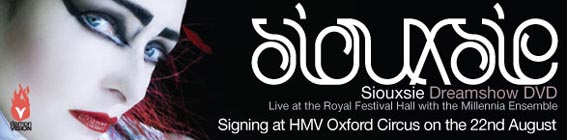 Still kicking ass with dignity London's Royal Festival Hall may be a far cry from Siouxsie's less glamorous beginnings at the 100 Club, but then, it's been nearly three decades since Susan Ballion and her Banshees first formed (with a pre-Pistols Sid Vicious on drums). Recorded last October, Dreamshow captures Siouxsie Sioux on her first ever solo tour (though Banshees/Creatures original member and co-songwriter Budgie is still banging away on drums). The disc features a lengthy 27-track live set consisting of classic Banshees tunes and Creatures tracks, complete with an impressive orchestra and a voice that's still sounding great. While it's not exactly the rough and raucous sound you'd expect from a gal who kicked off her career in the UK with 'Hong Kong Garden', the show is a stylish and often beautiful event that sees the first lady of punk delivering her very best tunes with an orchestra assisted harmonic twist, while still retaining the evocative, sexy and seductive tone she's renowned for. The '100 Club' bonus five-track live set does away with the glossy visuals and theatrics, and opts for a shoddier approach that aptly suits the mood and environment of the place where Siouxsie & The Banshees first stunned audiences with a 20-minute rendition of 'The Lord's Prayer'. Tracks include 'Hong Kong Garden', 'Christine', '2nd Floor', 'Happy House' and 'Not Forgotten'. The interview segment with Siouxsie and Budgie is a short but sweet supplement, though the five-minute rehearsal and soundcheck material merely functions as packaging padding. Still, if the spirit of punk still lingers within you, you'll want this DVD, special features or no special features. Movie: 7/10, Extras: 5/10 Lee Giffiths 25/08/05 |