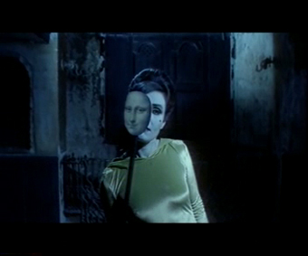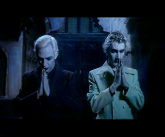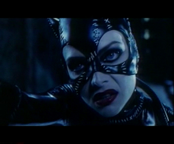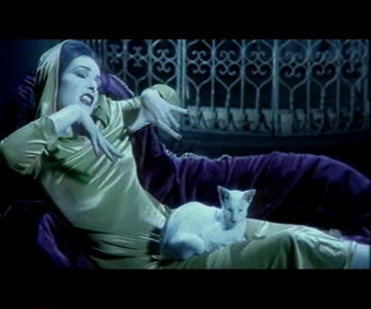 | The band: Siouxsie Sioux, Steven Severin, Budgie. Although both Martin McCarrick and John Klein play on this track, they were not asked to appear in the video. Tim Burton asked the Banshees to write/record the theme song for 'Batman Returns'. The result of which was 'Face To Face'. The understanding was that Tim Burton would also direct the video for the song. So enthused was the film maker that he showed the band preliminary sketches of characters that he would include in the shoot, some of which would ultimately end up in his own film 'A Nightmare Before Christmas'. However, preview audiences showed signs of not enjoying Burton's original ending for the film, in which Catwoman dies, and he was called back to re-edit/shoot a new ending. Burton's renewed schedule meant that he was no longer available to shoot the video and he handed the reigns over to Neil Abramson. The video itself is grandly Gothic, in the true sense of the word, with beautiful sets throughout. Siouxsie looks stunning in her appropriation of the Catwoman look , tight, black, rubber/vinyl backless dress with the obligatory stiletto boots. Severin and Budgie are relegated to Penquinesque grotesques, shuffling, bowing and at one point swinging from the rafters like sleeping Vampire bats. The band footage is inter-cut with scenes from the film. Classic moment; Siouxsie reclines on a Chaise Lounge, gazing into a mirror that is backed with a close-up of the face of the Mona Lisa. | ||