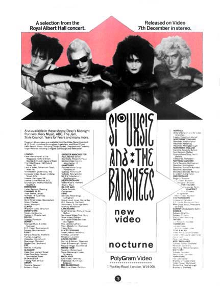 Siouxsie's immaculately crafted look - where silent star Theda Bara meets Sandie Shaw via Marc Bolan - was the perfect embodiment of The Banshees' sound. A sad-eyed mask of dark, doomed, vaguely archaic romanticism, her image had moved on from the obviously confrontational appeal - and apparel - of the band's early punk days, creating instead a distinct netherworld of its own. That such a unique trademark became a weird, even feared, feature of every suburban enclave is even more remarkable. But during the early-to-mid '80s, the ubiquitous Siouxsie clone was a highly visible subcultural phenomenon. much had changed since The Banshees' pop-baiting early days. By autumn 1983, punk's proudest outsiders had infiltrated the mainstream, as five Top 20 albums, a string of Top 20 singles and worldwide tours confirmed. And the band had just enjoyed their first Top 3 hit single, and exotically perfumed version of The Beatles' 'Dear Prudence'. the performances at London's Royal Albert Hall, on 30 September/1 October 1983, marked the climax of an era set in motion by 'Juju', the band's fourth album released in June 1981, "Juju was the first time we'd made a 'concept' album that drew on darker elements," says bassist Steven Severin. "Because the imagery we used for 'Juju' was the most confident and fully realised up to that point, it's also one of the most enduring in people's perceptions of the band. That's when people started saying it was the first ever 'Gothic' album." "'Juju' did have a horror theme to it," adds Siouxsie, "but it was psychological horror and nothing to do with ghost and ghouls." "More thriller than horror," guitarist John McGeoch reckoned back in 2003, "more blood dripping on a daisy than putting fangs into something." The dark, often oppressive sound of 'Juju' made perfect sense in a post-punk world. Since 1977, an entirely new wave of largely amateur musicians had emerged, many of whom chose to articulate everything that was angry and uncomfortable about their lives. From Throbbing Gristle to Joy Division, the message was no longer 'Anarchy in the UK' but something more private and disturbing. By the early '80s The Banshees, who had specialised in sonic psychodramas from the start, had perfected the art of darkness, as 'Nocturne' so spectacularly captures. The two shows filmed for this release capture The banshees at the peak of their post 'Juju' powers. Already an icon, Siouxsie now had the voice to match, a thrilling hullabaloo from hell that would occasionally break out into a gorgeous, lyrical romanticism. Drummer, Budgie, who joined the band in September 1979, brought sophisticated textures and colour to the sound. Bassist Steven Severin, who'd been there from the beginning, created giant, nagging riffs that provided the motor for much of the band's best material. And on guitar, The Cure's Robert Smith, once again sitting in for an errant Banshee's player. Smith first guested with the band in 1979, after guitarist John McKay had walked out with original drummer Kenny Morris in a spat that threatened to destroy the group. His services were called upon a second time in November 1982 after John McGeoch suffered a personal breakdown. This time, Smith stayed with the band a little longer, although it's true to say that it's the guitar-work - not to mention the spirit - of McGeoch, who died in 2004, that is all over 'Nocturne'. "John was such a great musician," says Siouxsie, "and he didn't go for that obvious chuffa-chuffa sound. He was so easy and inspiring to work with." In a nod to the venue's classical tradition, the 'Nocturne' shows were unveiled with a dramatic extract from Stravinsky's 'The Rte Of Spring', itself a shocking piece of musical iconoclasm when premiered back in 1913. Inevitably, perhaps, The Banshee's set draws heavily from their two most recent albums, 'Juju' and 'A Kiss In The Dreamhouse, songs both written and recorded with McGeoch. Among the 'Dreamhouse' songs ('Painted Bird', 'Cascade') is 'Melt!', a sumptuous, delicate waltz that deserved more than its lowly Top 50 placing the previous December. 'Juju' yields two centrepieces of the band's early '80s repertoire. 'Night Shift' starts out at punishing horrorshow pace, gets engulfed in some harsh, expressionist lighting, and builds to a tormented climax amid howls of feedback. A similar incantatory spell is weaved on the self-referential 'Voodoo Dolly', which builds sinisterly as a fabulous fog of fear descends down on the stage prompting further musical derangement. Also from 'Juju' is the hit single 'Spellbound' and 'Sin In My Heart', with Sioux strumming some of her own rudimentary guitar chords. Another stately sounding single, 'Israel', opens the set, though The Banshees always undermined any hit machine tendencies by including a couple of lesser-known B-Sides - in this instance, 1919's 'Pulled To Bits' (featuring 12 string acoustic guitar) and the classic flip to 1980's 'Christine', 'Eve White/Eve Black'. Completing the set are 'Switch' and the inevitable rousing finale, 'Helter Skelter', two epic pieces from the band's 1978 debut album, 'The Scream' Complementing 'Nocturne' is 'Play At Home', a film made for Channel 4 and broadcast alongside extracts from the Albert Hall shows. But this was something else entirely. While other bands selected for the series stuck closely to aspects of music-making, says Siouxsie, "We decided to make our own little movie". The centrepiece was a drunken restaging of The Mad-Hatter's Tea Party from 'Alice In Wonderland', though there was also room for music from the band side-projects The Creatures (featuring Siouxsie and Budgie) and The Glove (alias Steven Severin and Robert Smith). Written, directed and conceived by the band themselves, the finished product was akin to watching breakfast TV on acid. Rounding off this newly mastered package is the promo video for 'Dear Prudence', plus 'Melt!' and 'Painted Bird' filmed in November 1982 for BBC-TV's 'Old Grey Whistle T